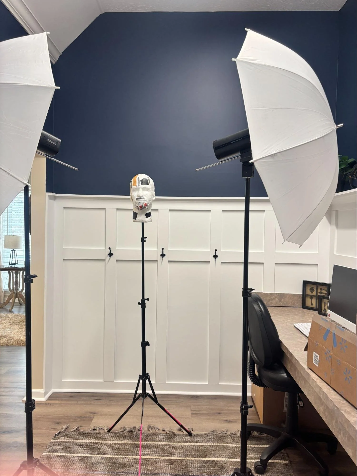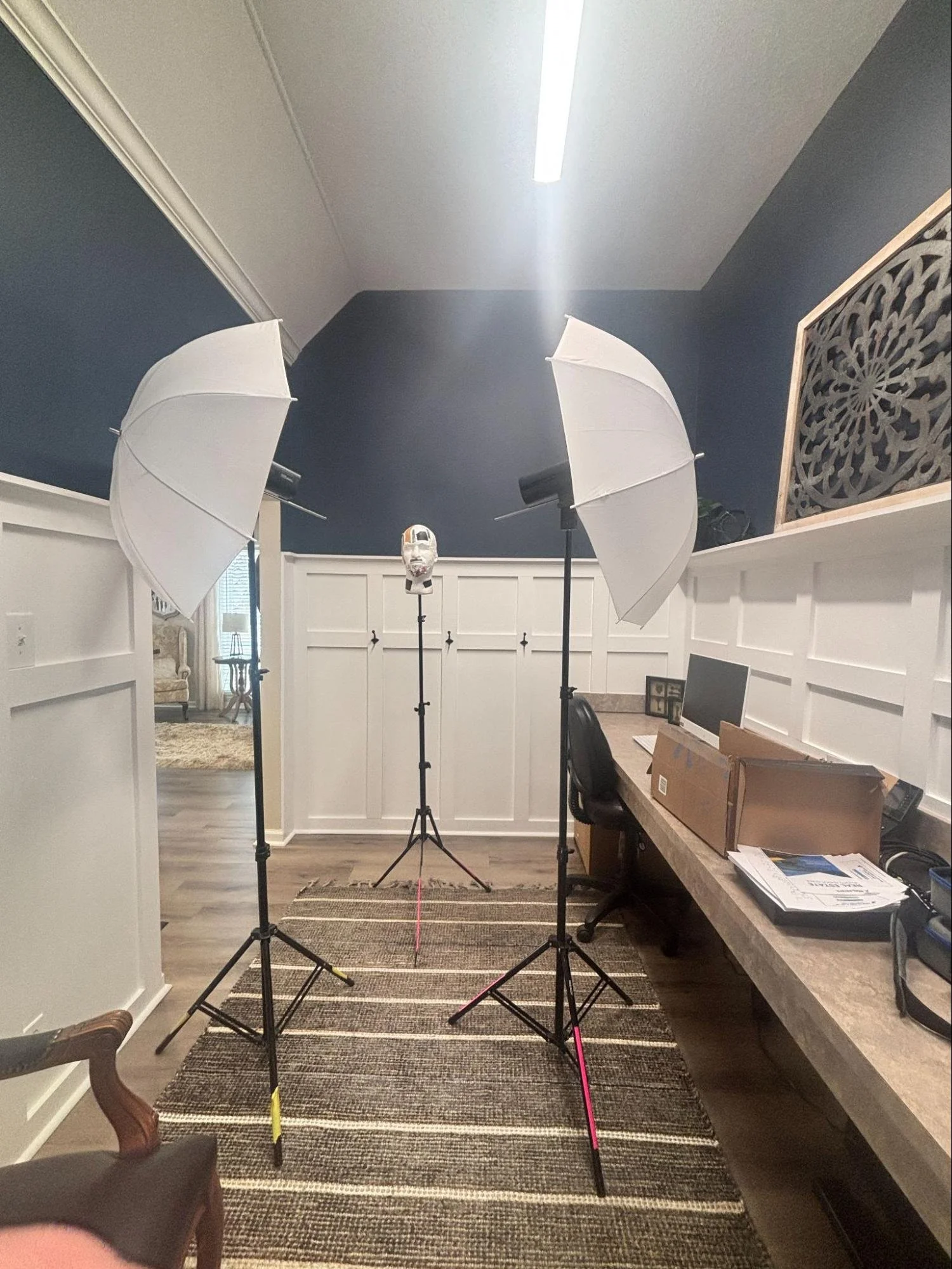 Here are the behind-the-scenes photos. Using an office space work area as a photography studio was perfect.