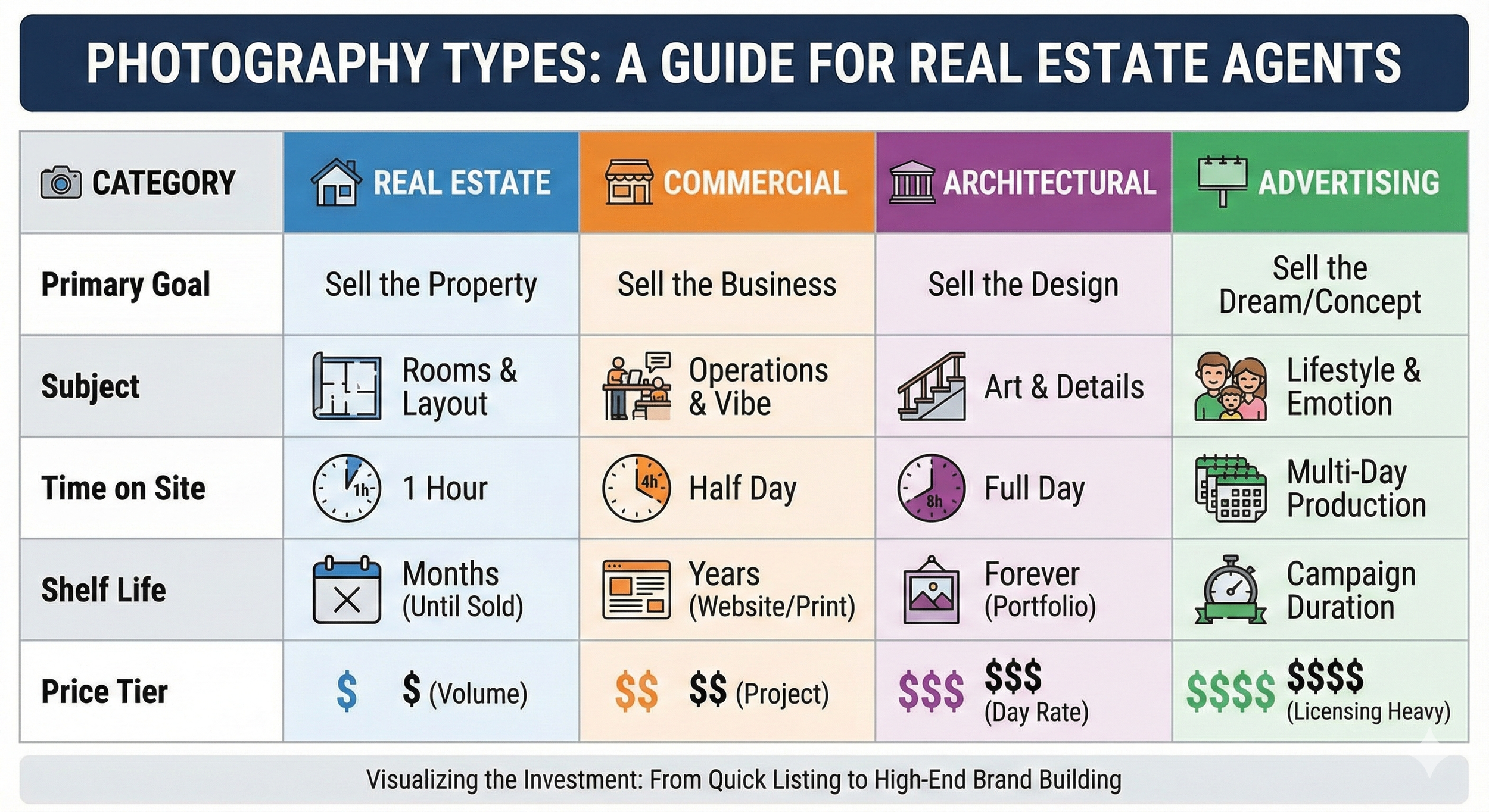 Here is a breakdown of the main categories. From a photographer's perspective, the equipment might look similar, but the intent, time involved, and licensing are entirely different.